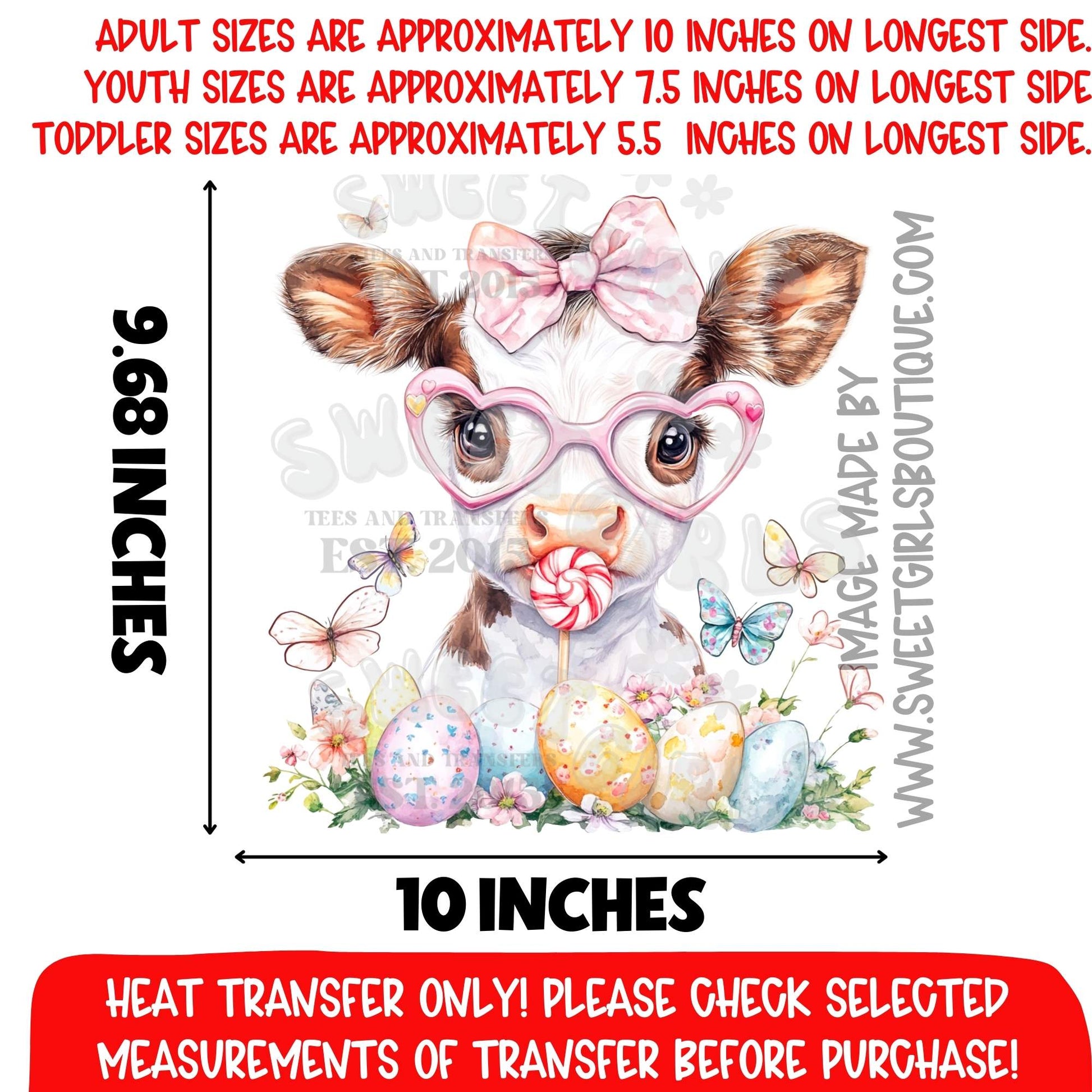 This spring Easter cow DTF heat transfer features a pastel cow with heart glasses, butterflies, florals, and colorful Easter eggs. Perfect for boutique apparel, kids Easter shirts, spring sellers, and high-demand cute cow graphics. NOT a shirt.