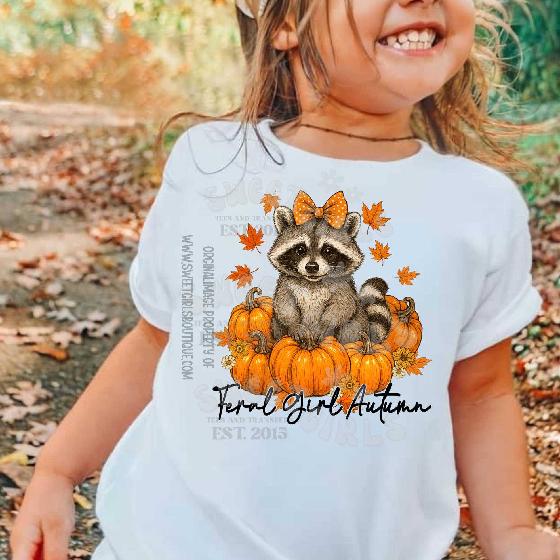 🦝 Cozy up for sweater weather with this adorable Feral Girl Autumn heat transfer! A sweet raccoon surrounded by pumpkins and fall leaves makes this design perfect for seasonal shirts and gifts.
