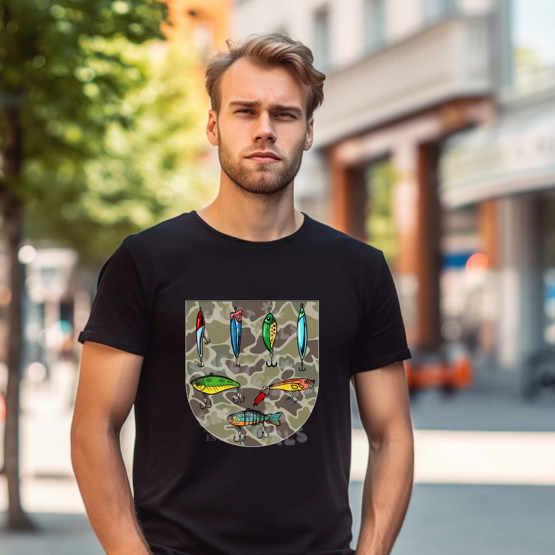 Fishing Lures on Camo Pocket HEAT TRANSFER – Realistic DTF Iron-On Transfer for Outdoor Apparel, Father’s Day Gifts, and Fishing Tees – Cold Peel and Washable