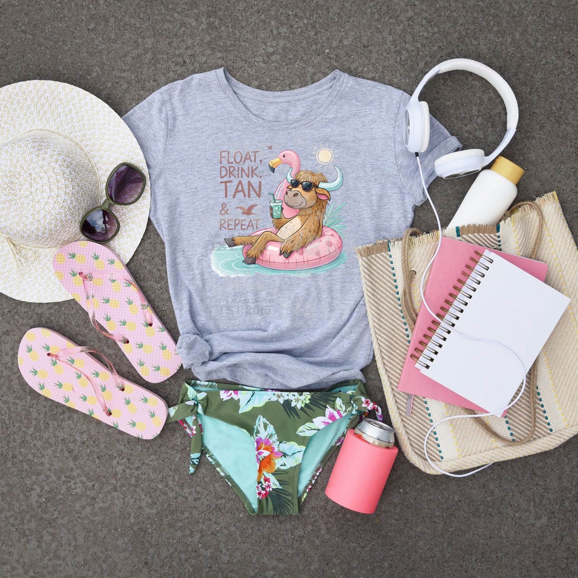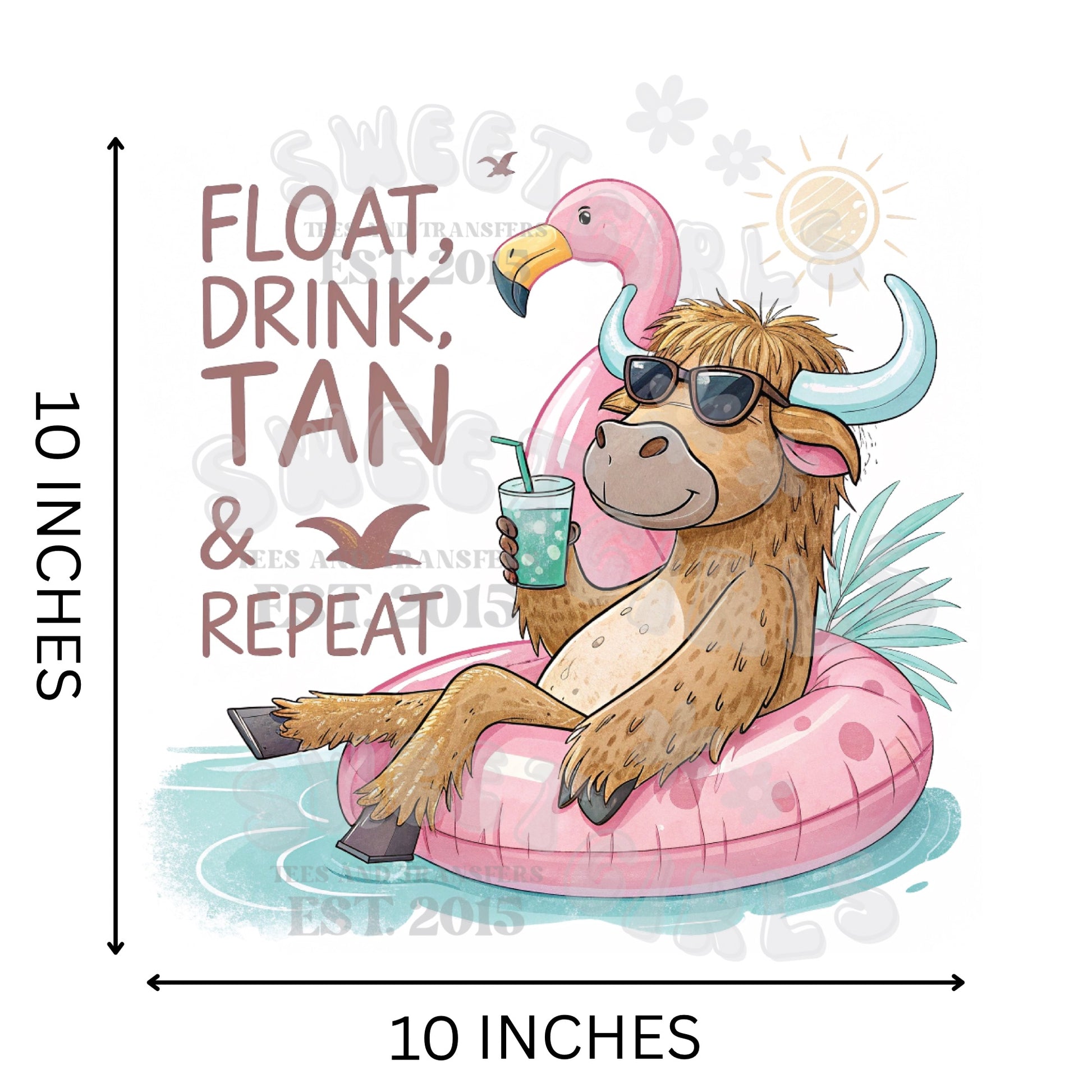 Float Drink Tan Repeat DTF Transfer – Summer Highland Cow Pool Float Heat Transfer – Funny Iron-On for Tanks, Tees, Towels & Bags