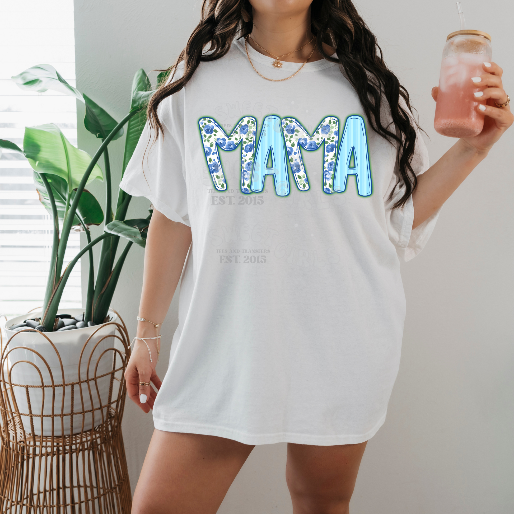 mama shirt, floral mama, blue roses, momlife shirt, mother’s day, dtf transfer, press ready, iron on, washable, heat press, gift for mom, diy decor