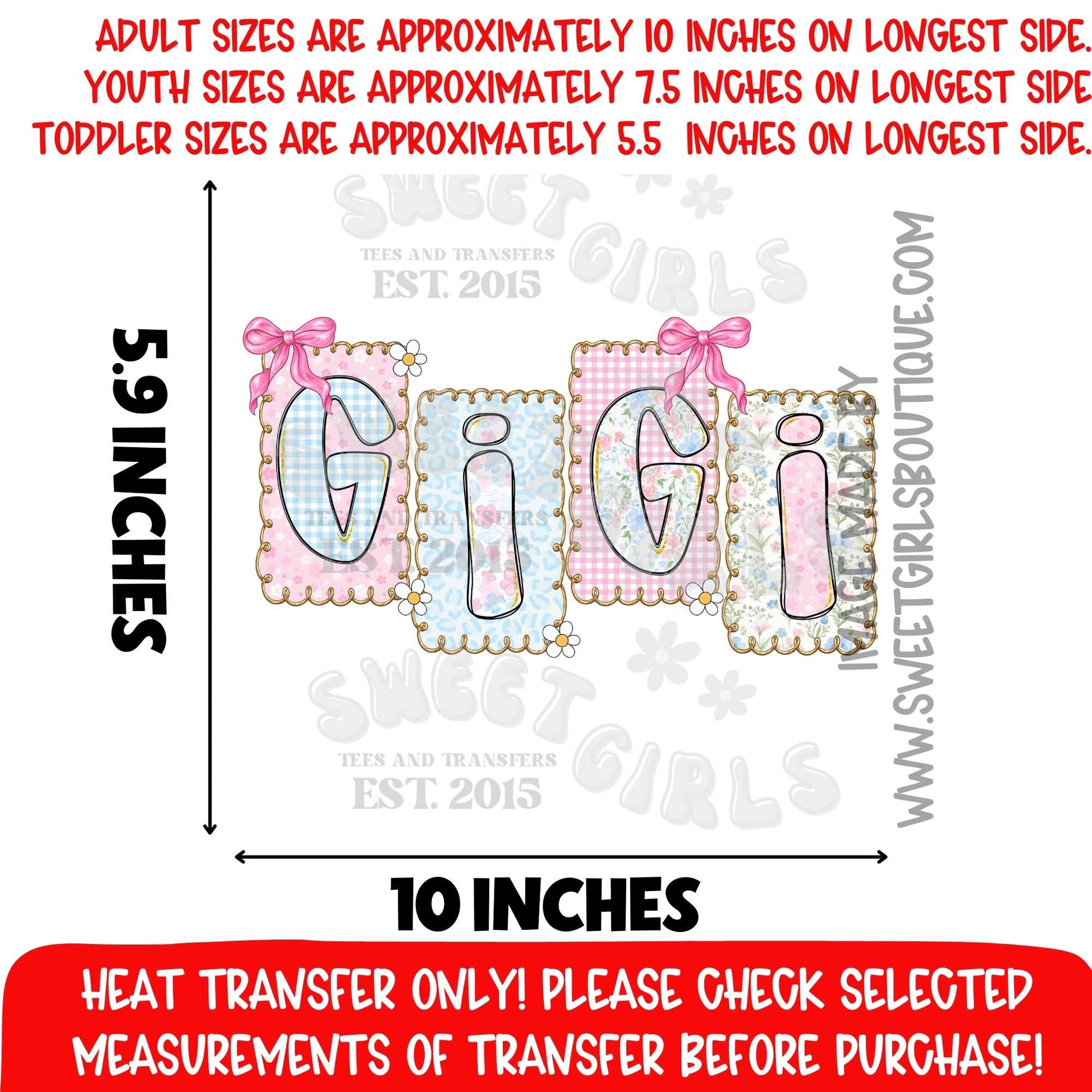 Soft pastel patchwork letter blocks spelling “GiGi” with bows and delicate floral/gingham prints—sweet grandma-core aesthetic for GiGi gifts and family shirts.