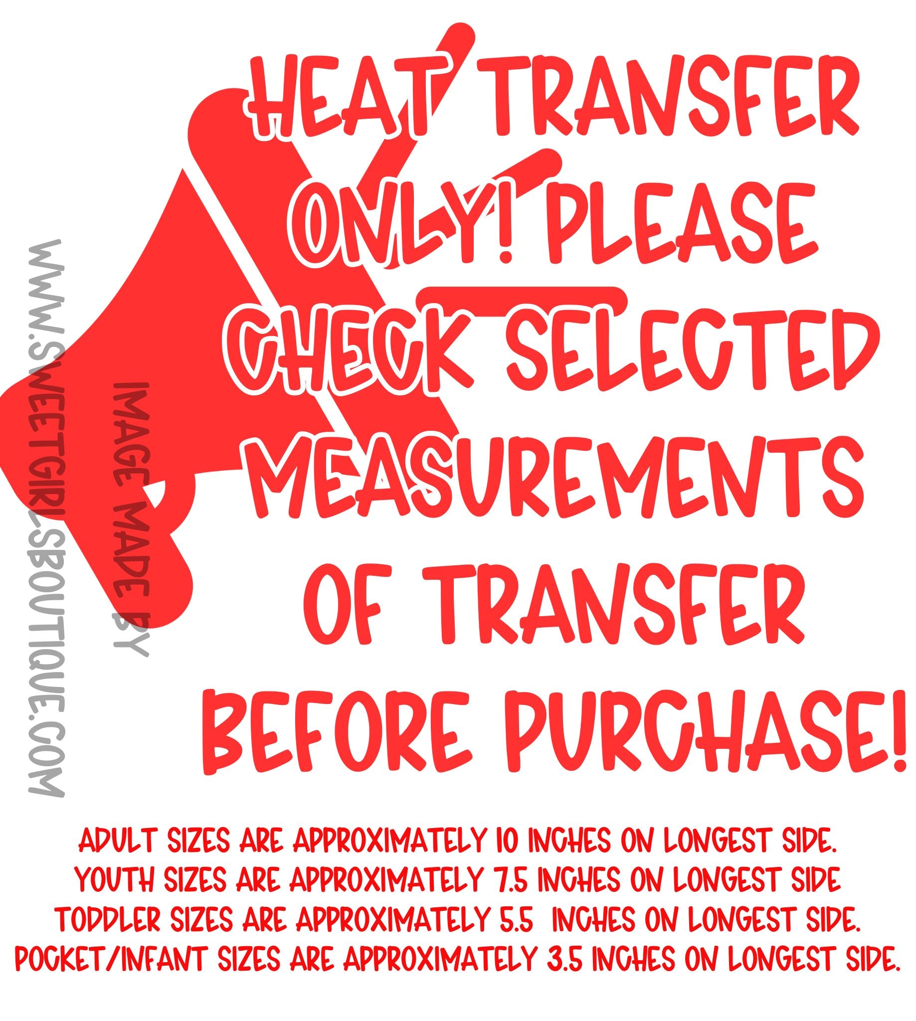 This is a high-quality direct-to-film (DTF) heat transfer, not a shirt. Choose your size when ordering – great for adults, kids, and toddlers!
