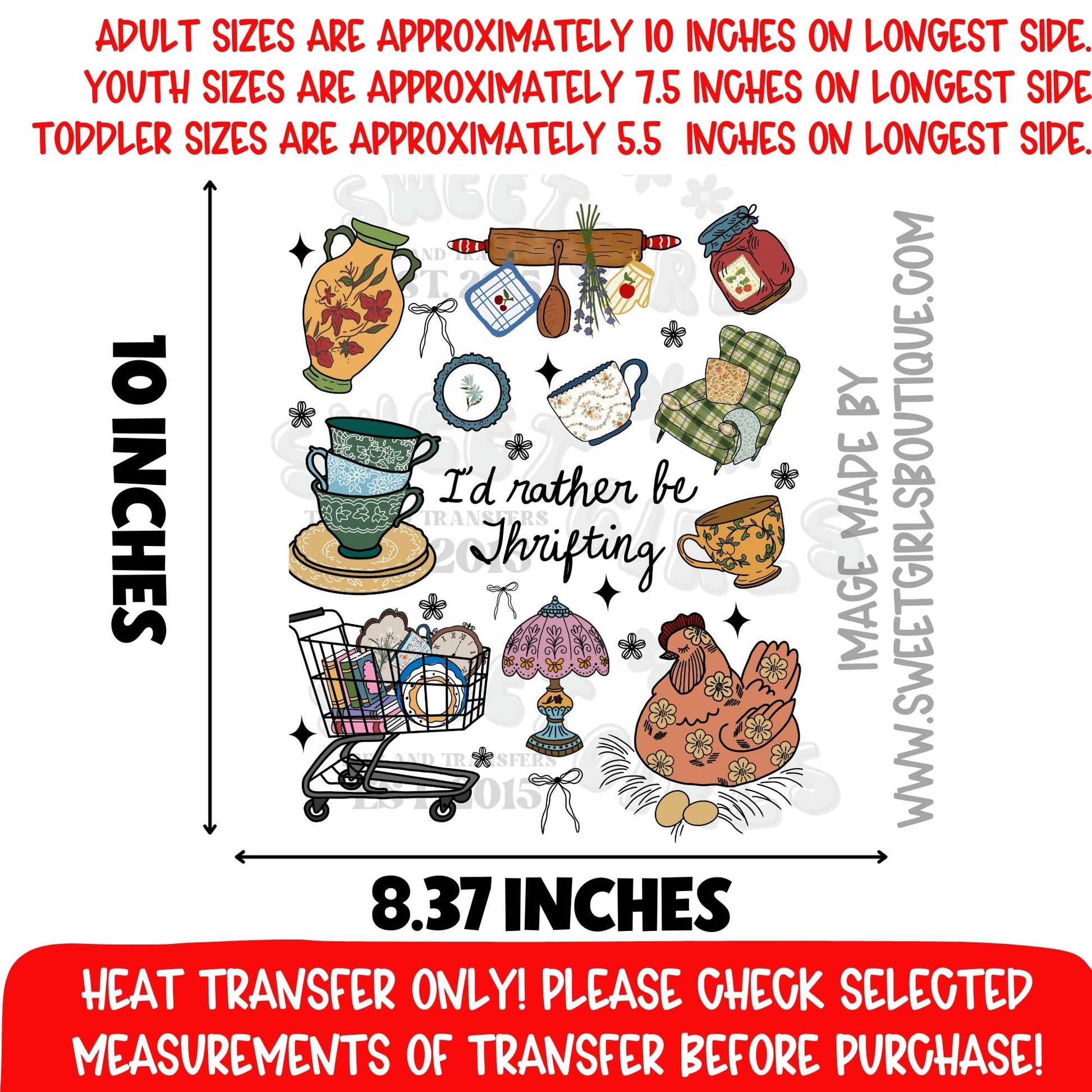I'd Rather Be Thrifting vintage kitchen collage design for antique and thrift lovers. Apply using a heat press at 300°F for 10 seconds, cold peel the film, and press again for 5 seconds with parchment paper for durability. For home irons: set to high cotton, press firmly for 15 seconds, let cool completely, peel cold, then press again for 5 seconds.