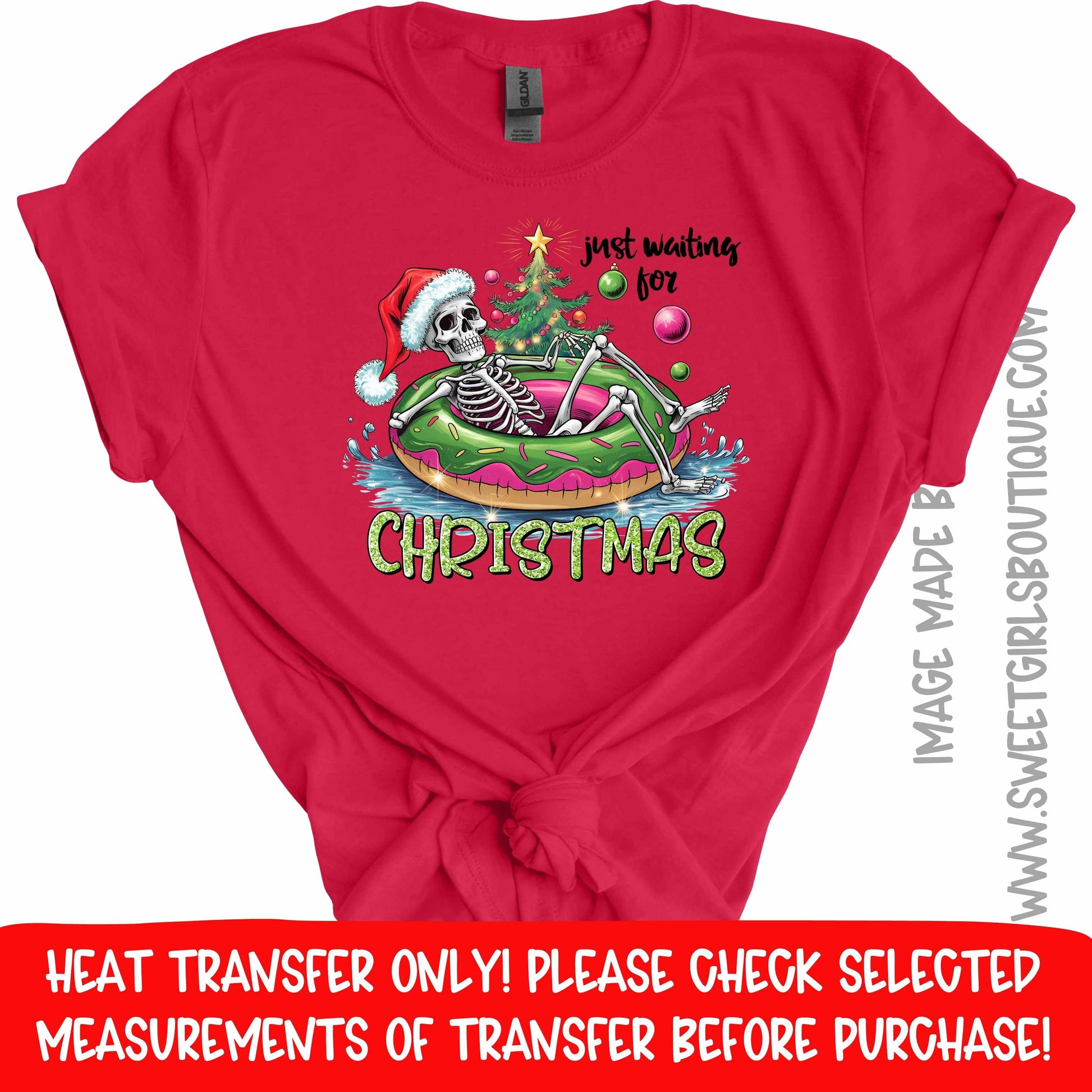 Just Waiting For Christmas DTF Heat Transfer – Funny Skeleton Santa Float – Holiday Humor Iron-On – NOT A SHIRT – Ready To Press Christmas Transfer