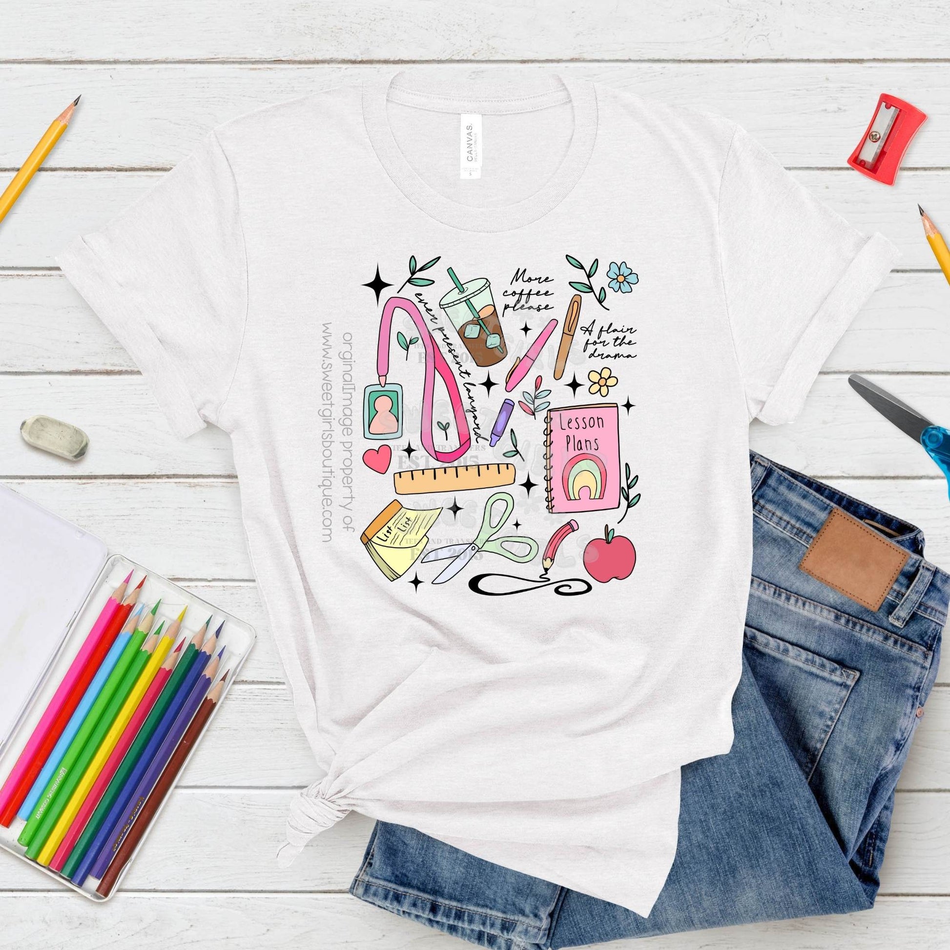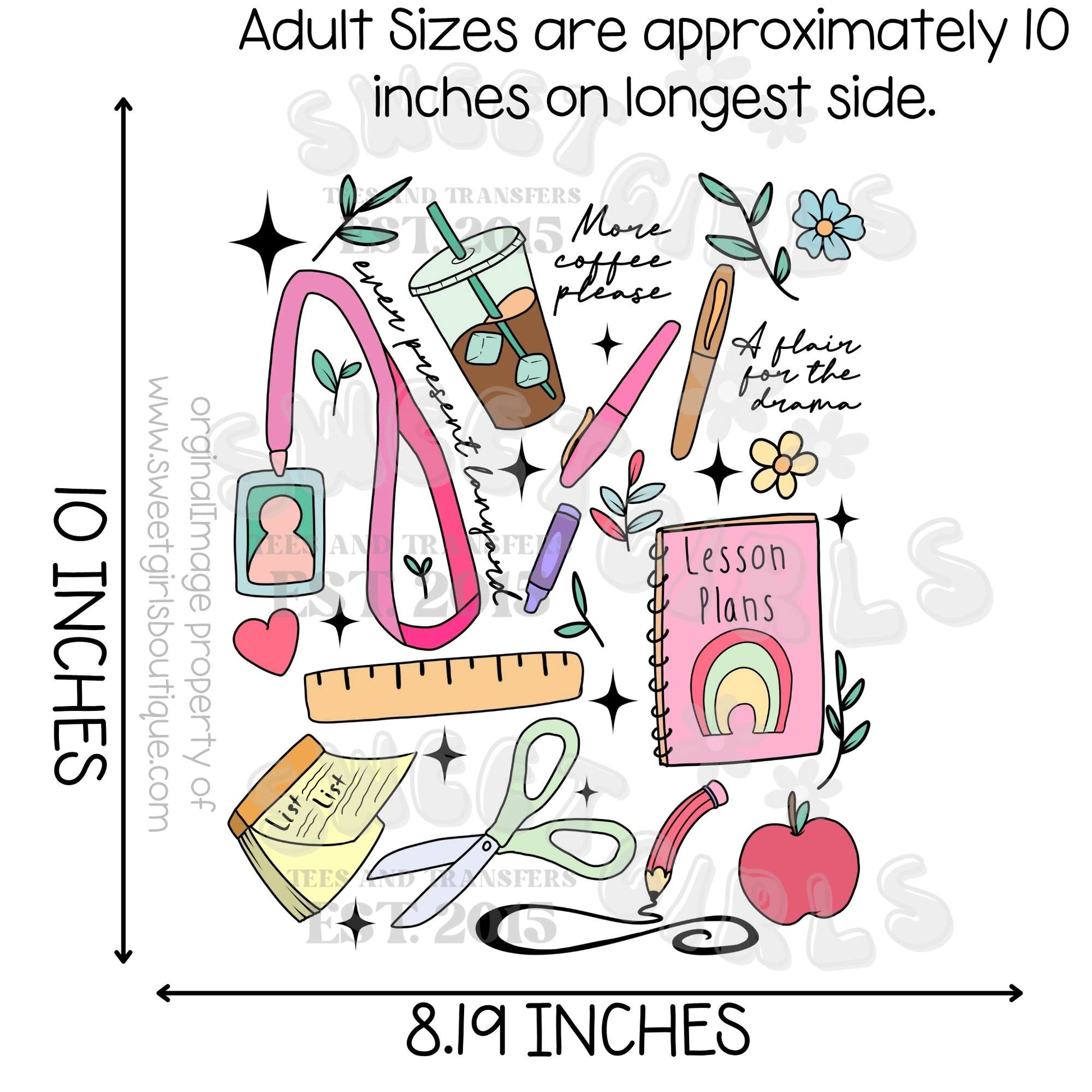 Fueled by coffee and chaos! This cute and trendy DTF transfer features lesson plans, rulers, scissors, coffee, and more—perfect for back-to-school teacher shirts.