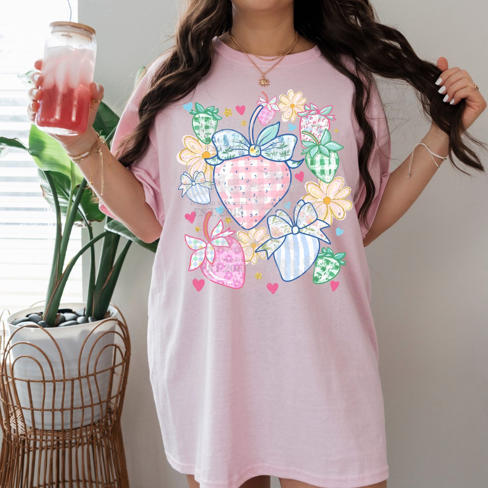 Pastel Strawberry Bow DTF Transfer – Cute Pink Gingham Fruit HEAT TRANSFER, Iron-On Direct to Film for T-Shirts, Bags, Decor