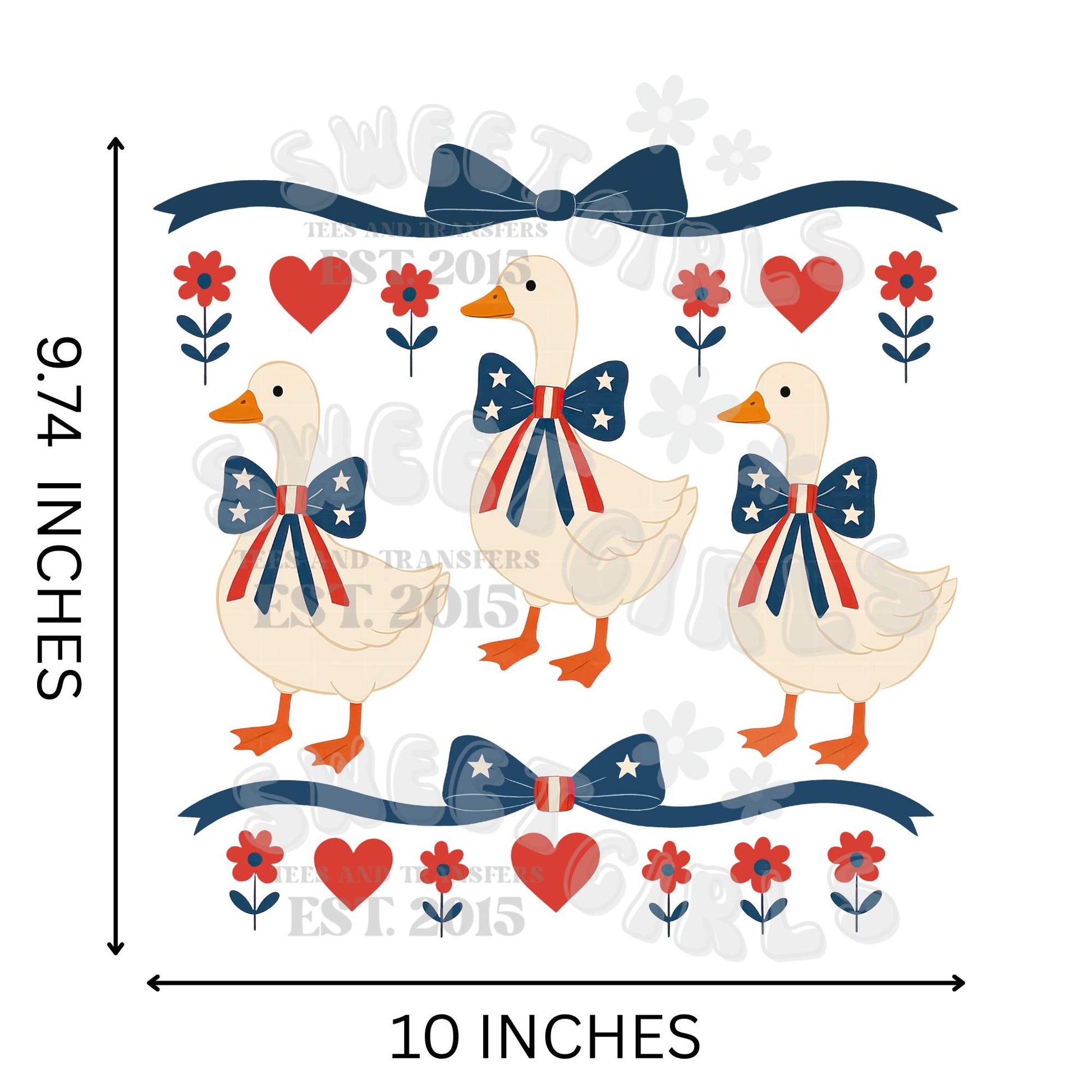 Add vintage charm with this 'Patriotic Goose Trio' DTF heat transfer! Three adorable geese in star-spangled bows bring festive flair to your 4th of July look. Perfect for shirts, totes, or seasonal fabric crafts. Press at 300°F for 10–15 sec, cold peel, then repress 5 sec. Compatible with iron or heat press.