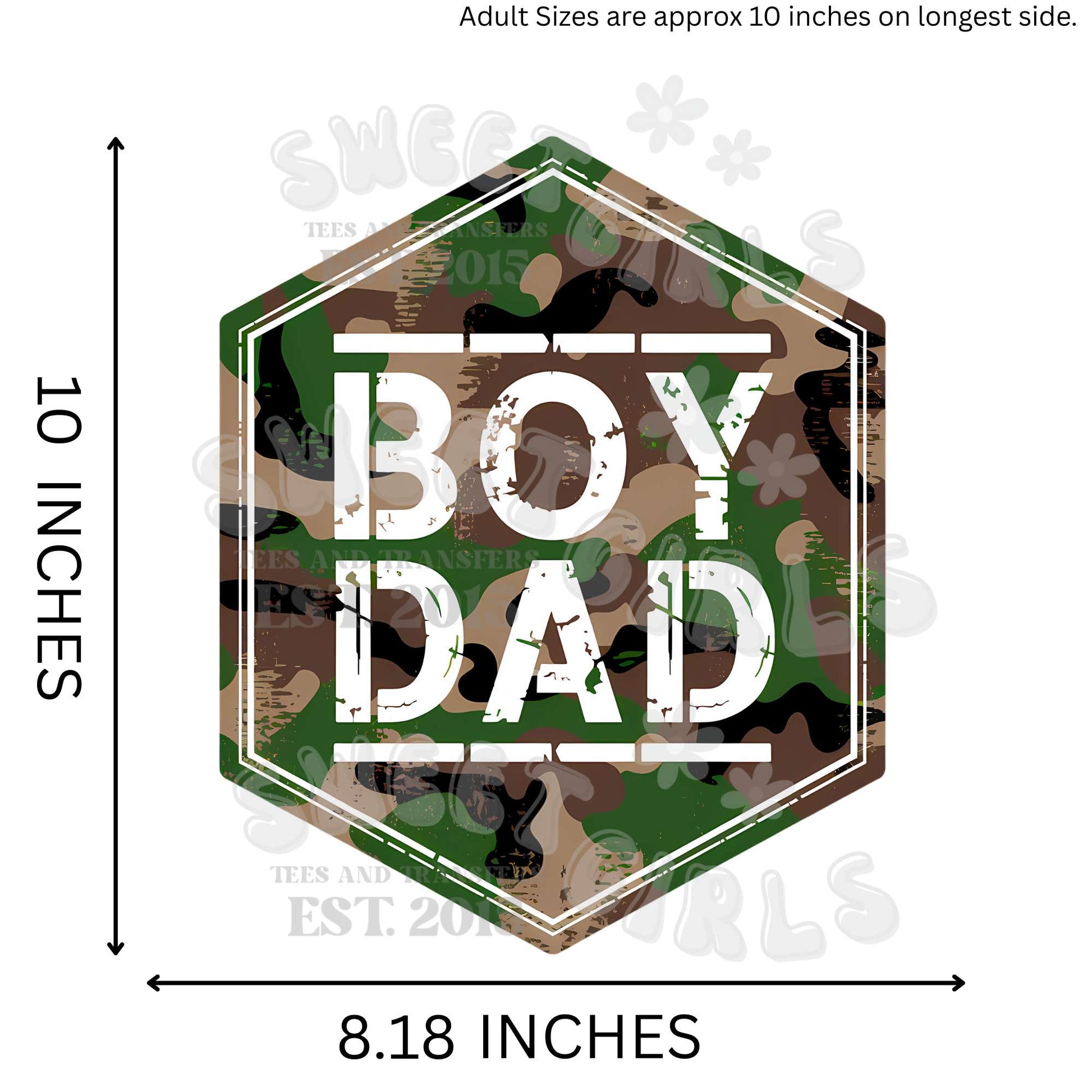 Ready to Press BOY DAD Camo Patch DTF Heat Transfer – Military-Inspired Direct to Film Iron-On for Shirts, Bags, and Decor – Durable, Washable Heat Press Transfer for Men, Gifts, Outdoors, Fathers