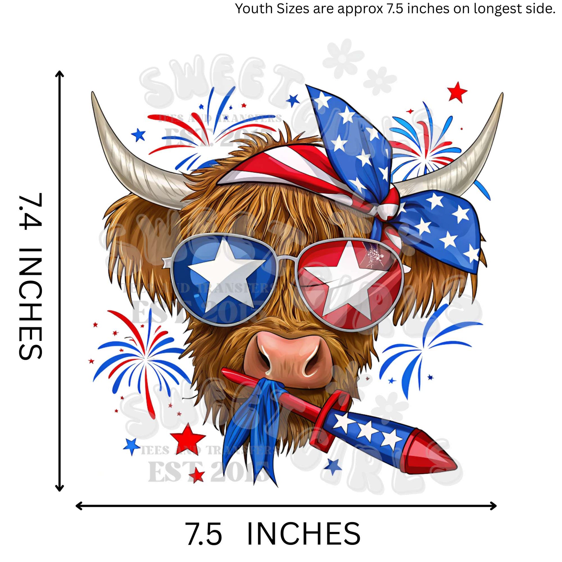 Ready to Press Patriotic Highland Cow Fireworks DTF Transfer – July 4th Red White Blue Cowgirl Heat Press Iron-On for Shirts, Bags – Direct to Film Summer Transfer for Farm Life Fans