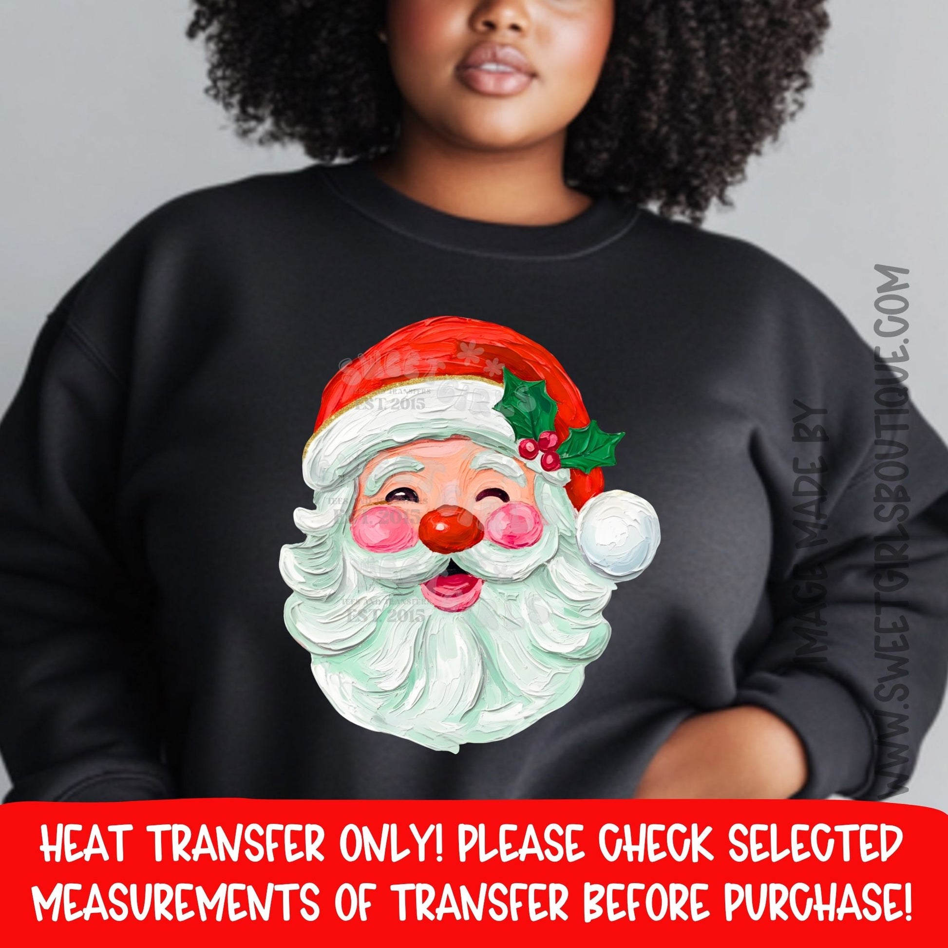 Vintage jolly Santa Claus DTF heat transfer with hand-painted retro look. Perfect for classic Christmas crafting and cozy sweatshirts. Smooth press, vibrant colors, cold peel and second press for durability. Heat transfer only – not a shirt.
