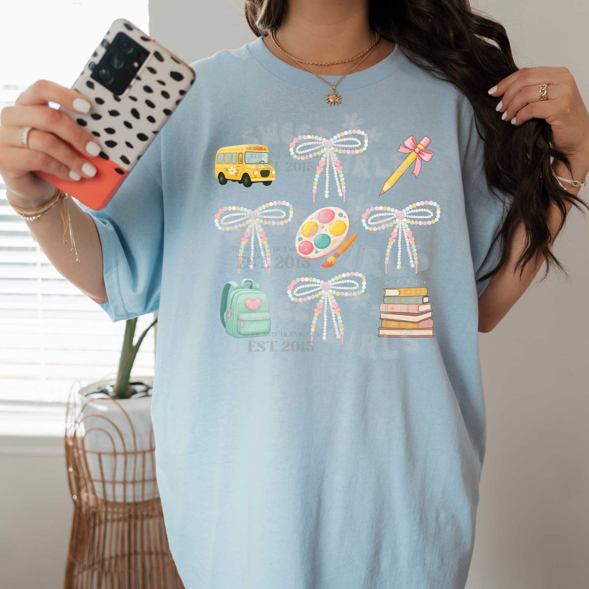 Watercolor Back To School Elements DTF Heat Transfer – Cute Backpack, Bus, Pencil, Books
